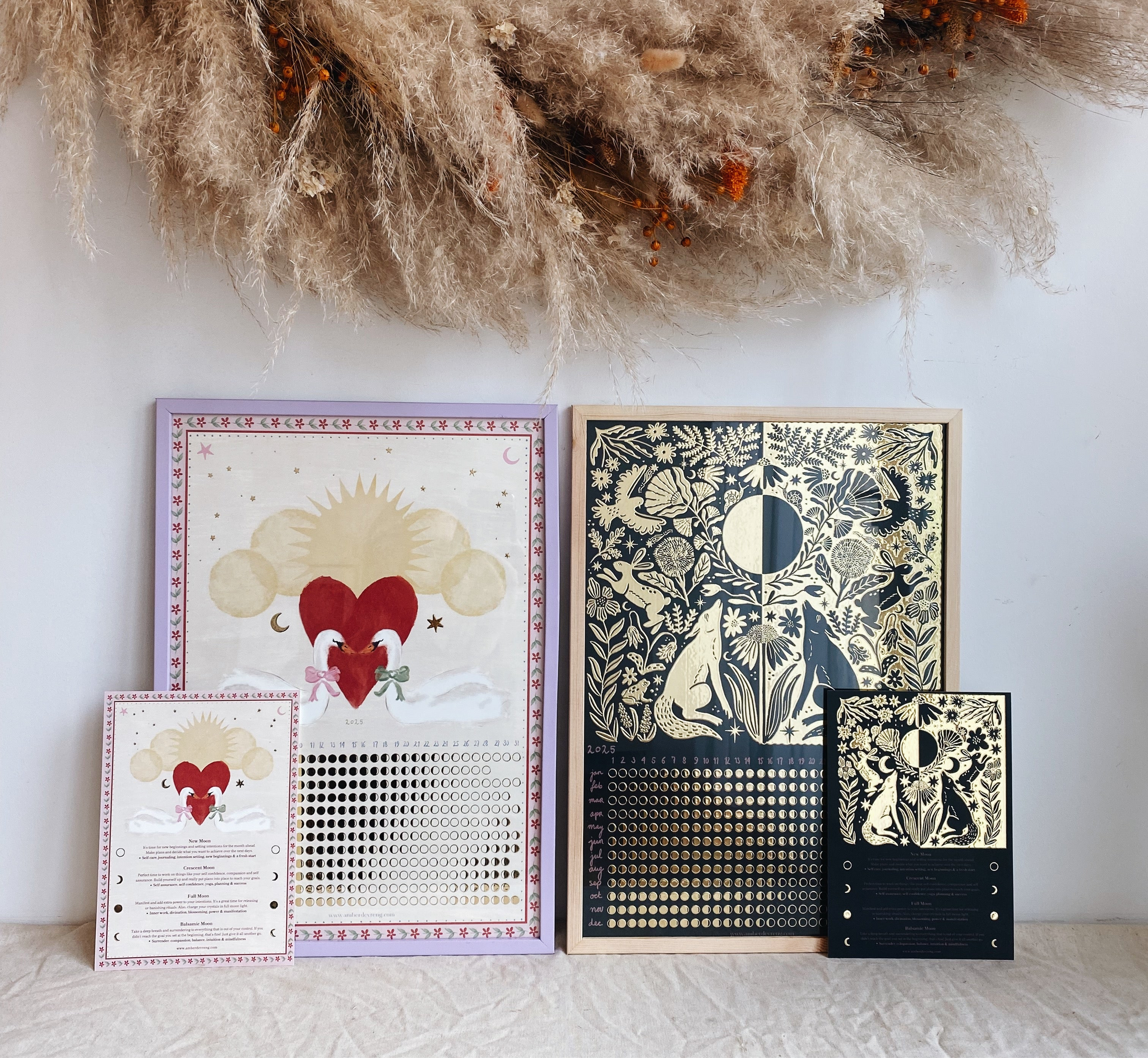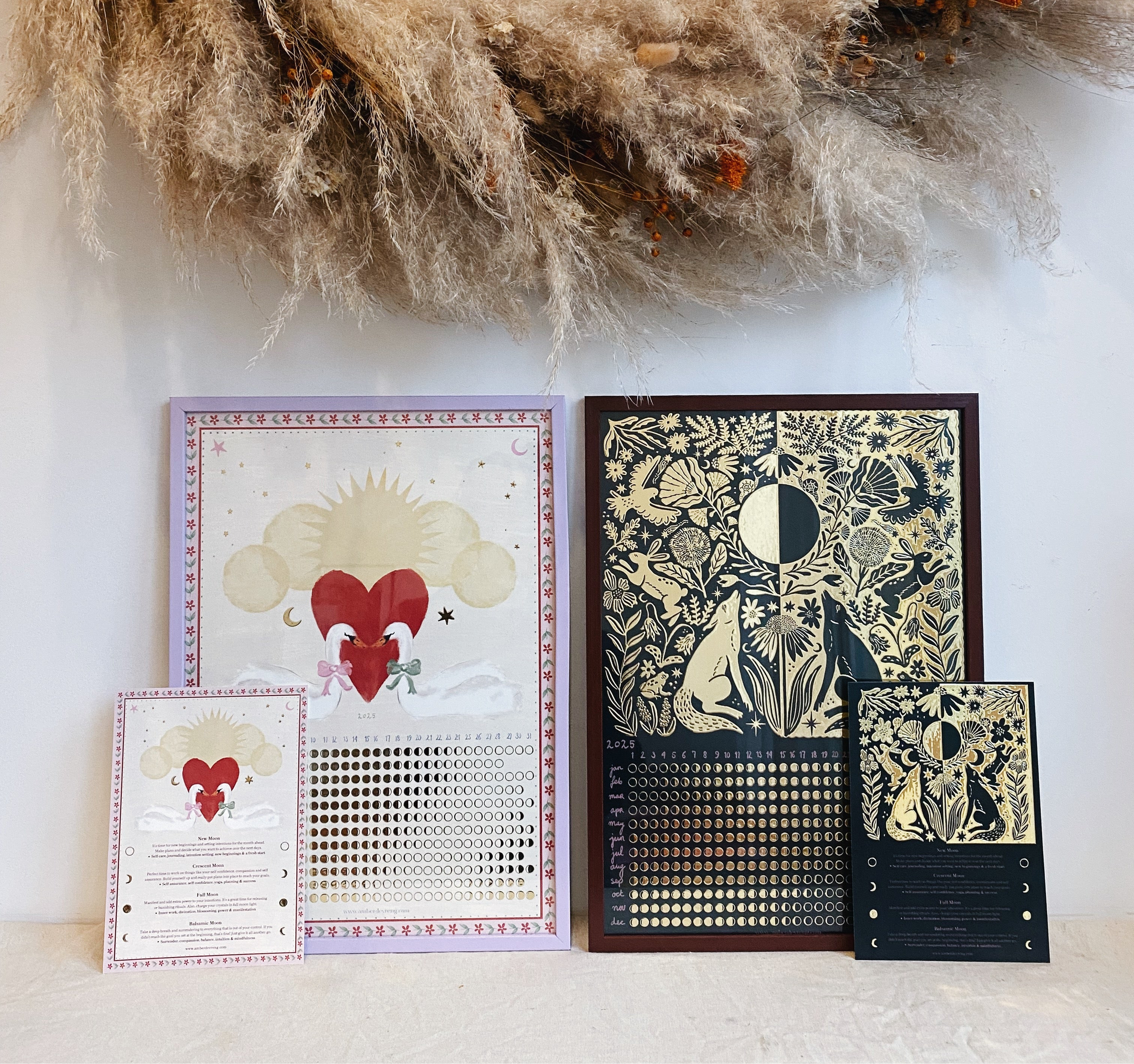 Moon Calendar of 2025 with all the moon phases from every day of the year. Includes a connecting guide with information which you can use to relate your feelings on a certain moon phase. Both printed with golden details.